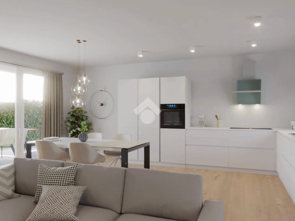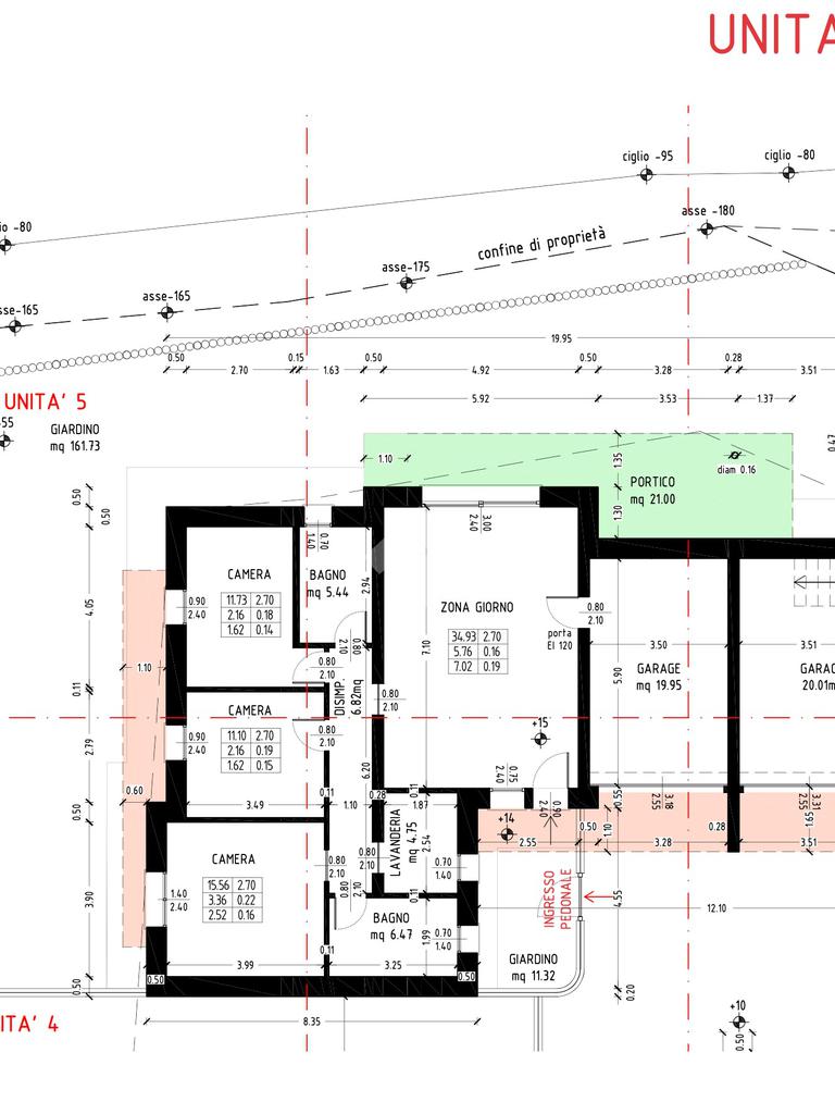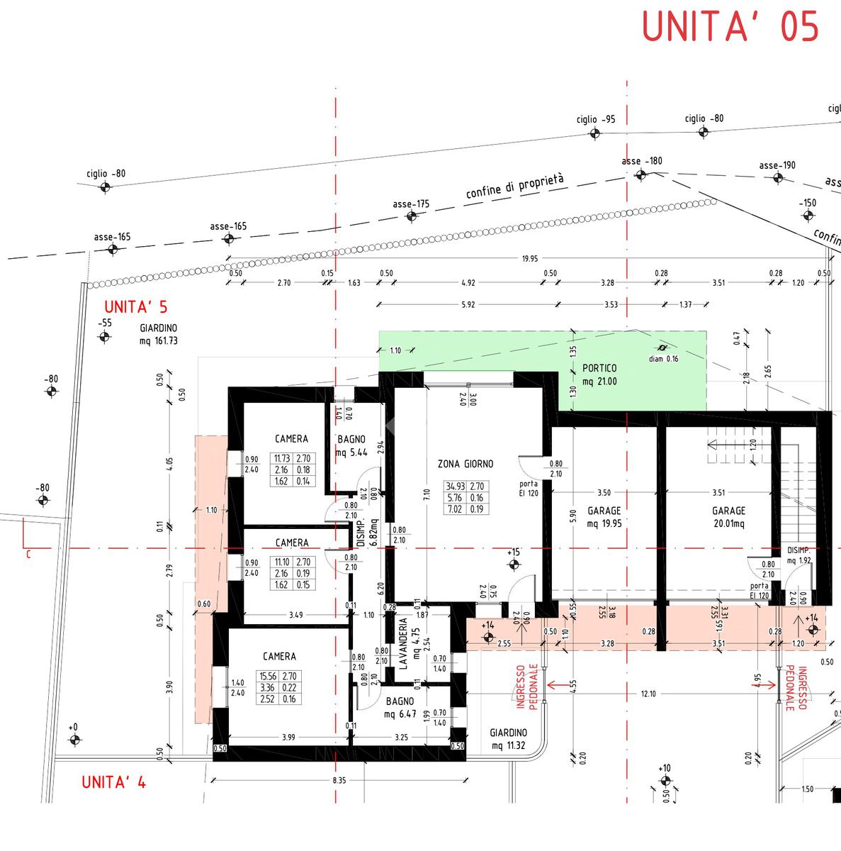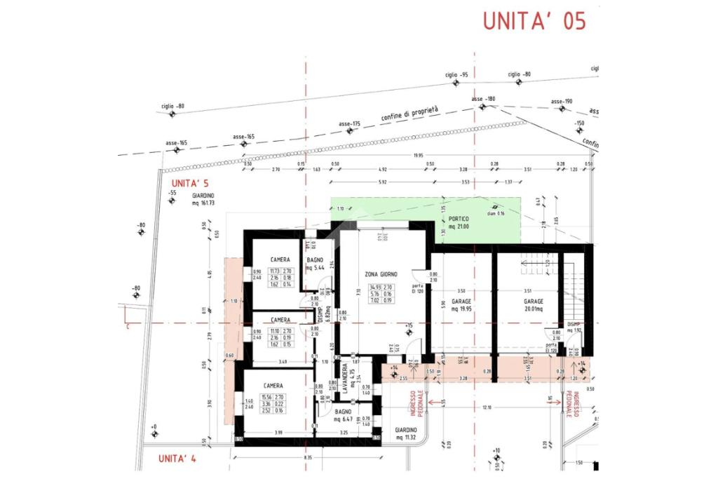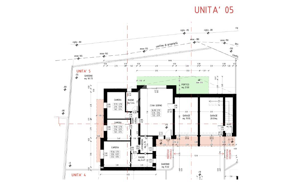 UNITA' 5 : appartamento piano terra in bifamiliare con ingresso indipendente, ampio giardino di ca 190 mq e portico privato, è composto da: ingresso, luminosa zona living open space, tre camere da letto di cui due matrimoniali, due bagni ed una lavanderia. garage e posto auto.