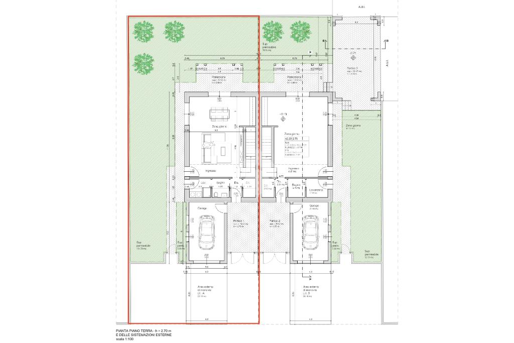 Le abitazioni sono disposte su due livelli, con al piano terra un'ampia zona giorno open space molto luminosa e razionale, un bagno ed una lavanderia; al piano primo tre camere da letto (la padronale con il proprio bagno) e un altro bagno dedicato per il piano. Ampio giardino esclusivo con pompeiana, garage e posto auto coperto completamente esclusivo.