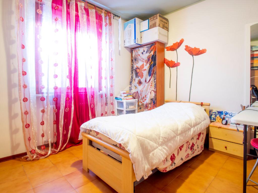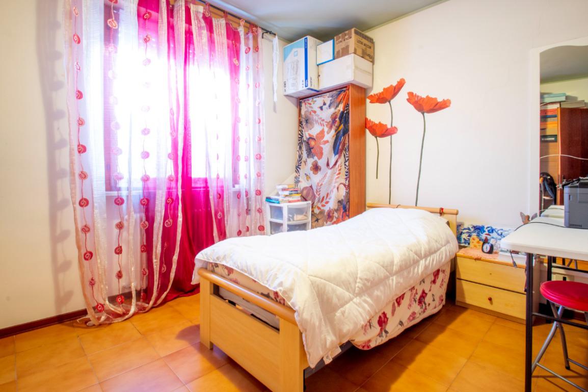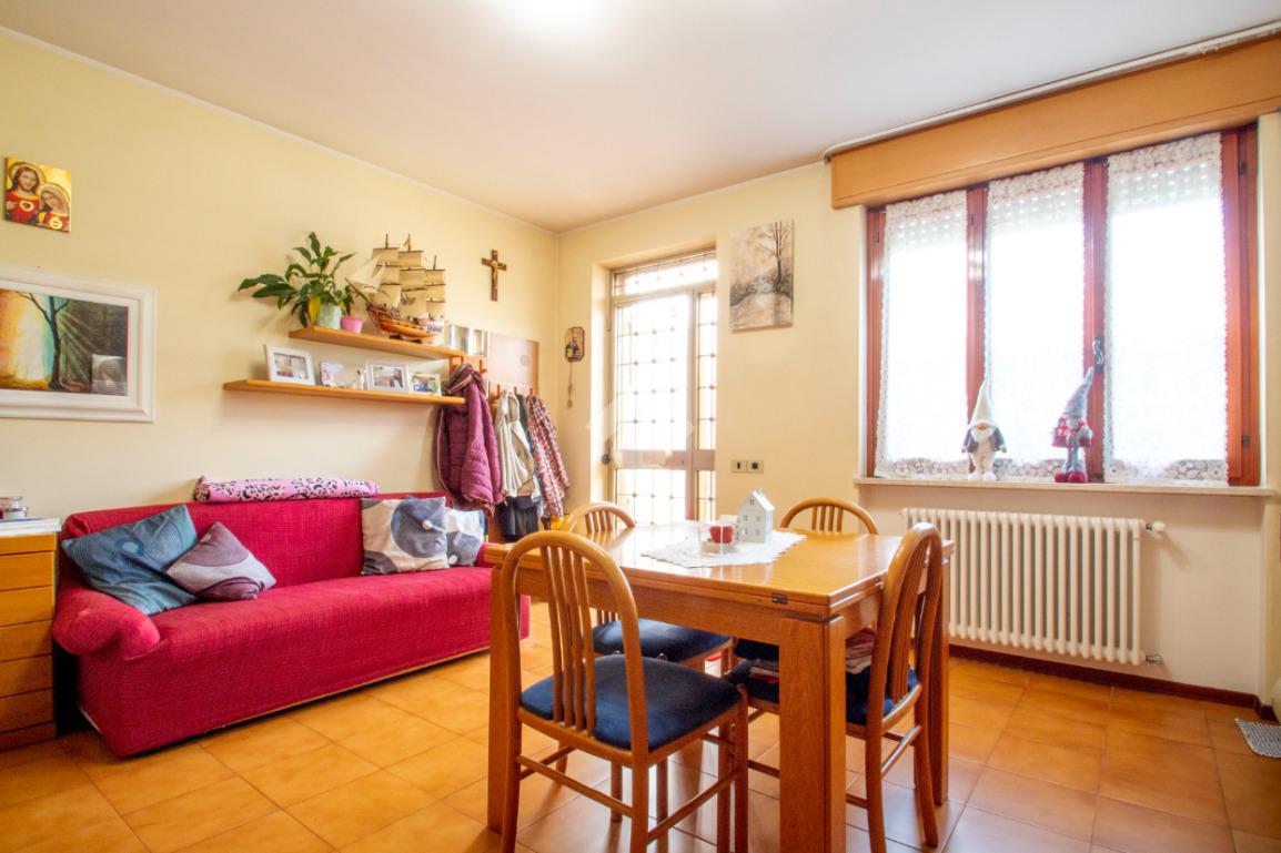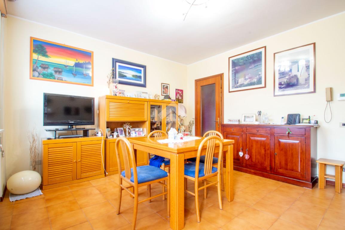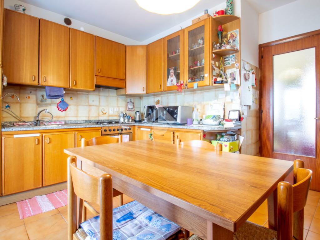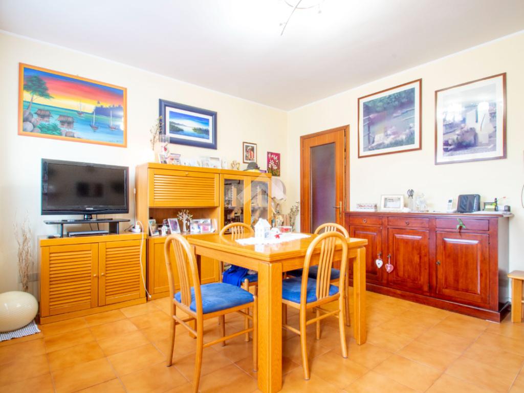 L'unità immobiliare è composta da un luminoso soggiorno, da una cucina separata con accesso diretto ad un terrazzo esclusivo, due camere da letto di cui una matrimoniale e l'altra di dimensioni generose, un bagno finestrato. Al piano seminterrato si accede tramite una scala interna e sono presenti: il garage ampio ma con spazio per una sola auto, una cantina e un secondo bagno (realizzato nei primi anni 2000). Caldaia e radiatori sono stati sostituiti di recente.